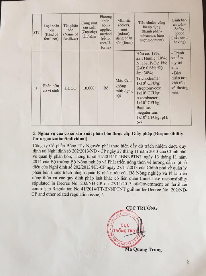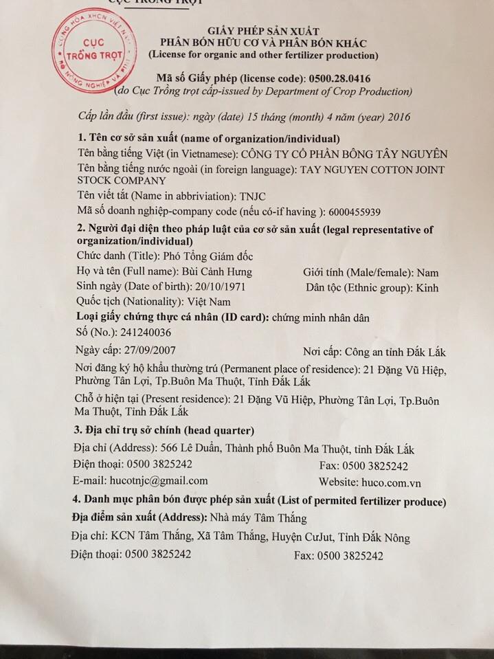 Cục Trồng trọt cấp Giấy phép sản xuất phân bón hữu cơ cho Công ty CP Bông Tây Nguyên
