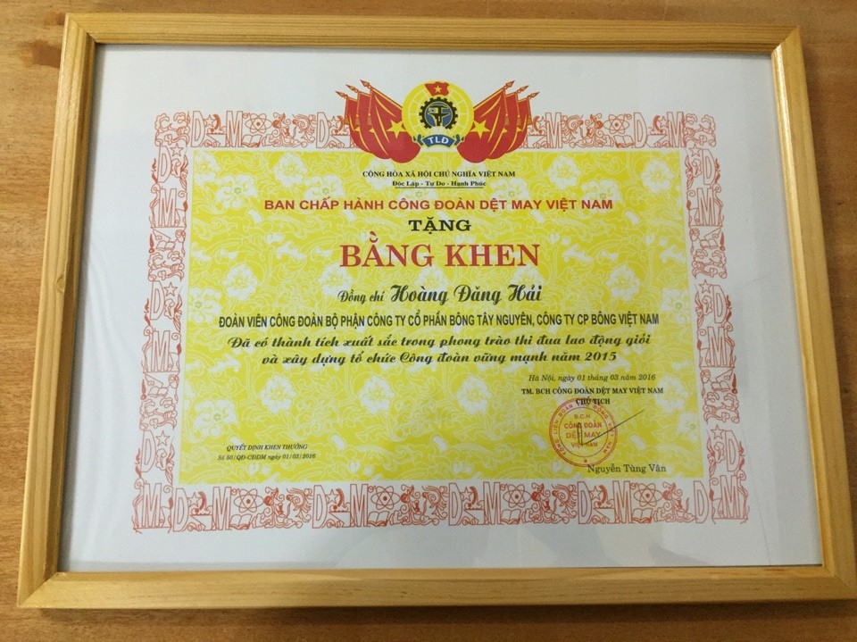Tổng Giám đốc và đại diện Công đoàn Công ty cổ phần bông Tây Nguyên trao tặng cho Đồng chí Hoàng Đăng Hải là Đoàn viên công đoàn bộ phận Công ty cổ phần bông Tây Nguyên, Công ty cổ phần bông Việt Nam bằng khen của Ban chấp hành công đoàn dệt may Việt Nam. Vì đã có thành tích xuất sắc trong phong trào thi đua lao động giỏi và xây dựng tổ chức Công đoàn vững mạnh năm 2015