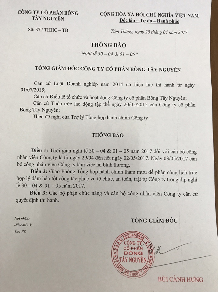 Thông báo lịch nghỉ lễ 30-04 & 01-05